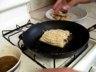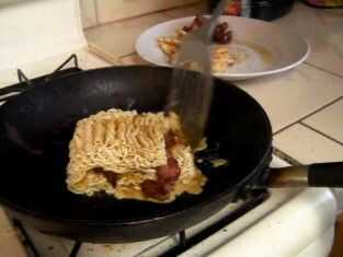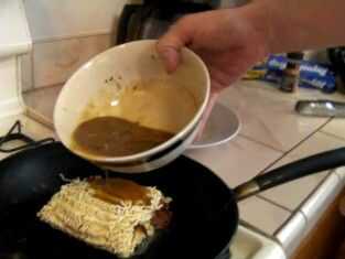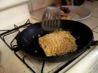 Una vez que la mantequilla ha sido establecida y comienza a derretir, colocar la ontop de fideos ramen de la cacerola. y se deja reposar durante unos 10 segundos. Luego añadir la mezcla de huevo y sabor a la parte superior del sándwich. La mezcla de huevo se filtrará a través de los fideos ramen y actuará como un agente de la vinculación para mantener unida a su emparedado. Esto se cocina durante unos 2 minutos por cada lado.