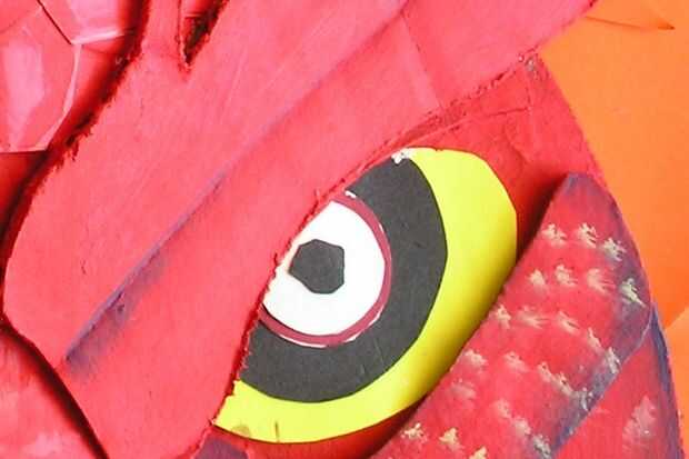 Aquí, hacer los ojos con cinco capas de papel: globo del ojo es de color amarillo; que rodea un aroura negro, alrededores de Iris son de color rojo, iris es de color blanco y la pupila es negra. Esto puede ser cualquier otra combinación, experimentar y ver lo que usted puede venir para arriba con. Ojos de pescado podrían funcionar!
