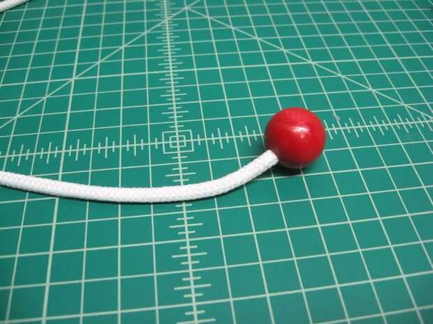 El extremo no anudado de la línea fue pegado en el orificio de la bola de arte con una pequeña cantidad de pegamento caliente. Muchas clases de pegamento podría funcionar; pegamento caliente es simplemente más rápido.