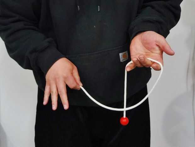 Mi suegro hace pivotar la bola hacia arriba (el mismo movimiento como el usado para los viejos juguetes de bola y Copa) y luego de arroja un lazo lazo, a través del cual la bola cae dando lugar a un nudo. Parece que no puedo hacerlo de esa manera con cualquier tipo de éxito repetido.