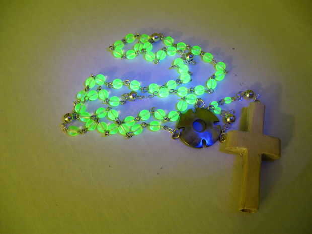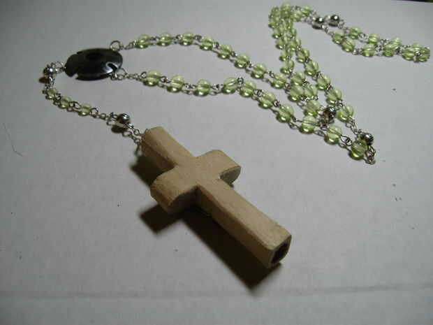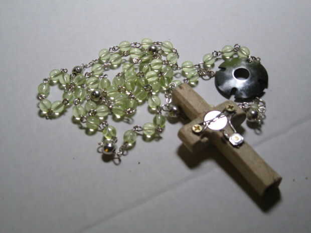Mi hijo tuvo que hacer un rosario de cosas que estaban alrededor de la casa. Tuercas y arandelas, legos, palomitas etc.... todo hecho antes. Mi esposa vio que un florero lleno de turcos cabeza nudos que he atado sobre los años y que era él.En cuanto