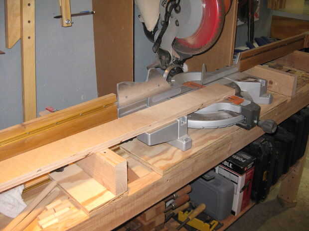 Mina hice con madera de desecho, que era 3 1/4" ancho y sólo pasó a donde quería guardar la parrilla. Aquí estoy cortando el general estante a 15" de largo, que se adapta a mi espacio deseado.