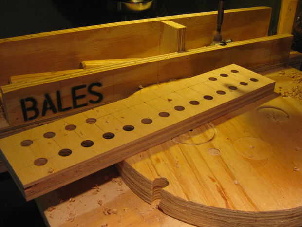 Puso mis orificios de 7/8" en cada borde y espaciados los 1" aparte. Mis brocas tienen una 1/2 caña, así que había perforado 1/2 agujeros con una broca forstner.