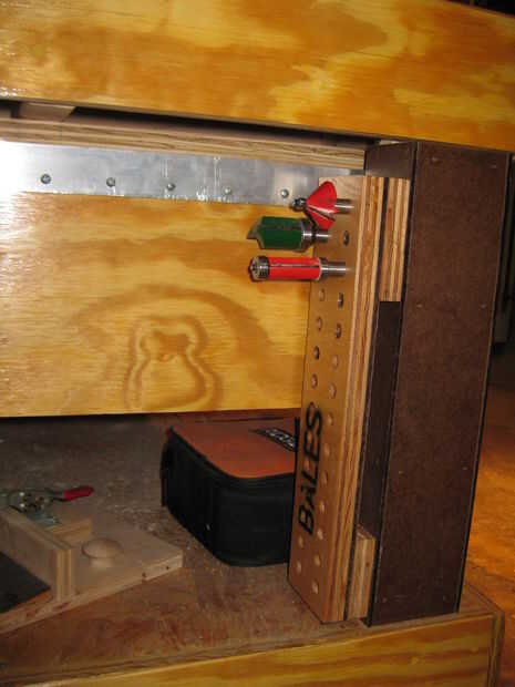 tengo una pared entera de almacenamiento Cala francés, que esto podría pasar.  Sin embargo, en este caso, había atornillado un acoplamiento pedazo de grapa a la pata trasera de mi mesa de fresadora.  Es fácil de acceso, fuera del camino y de otra manera espacio no utilizado.