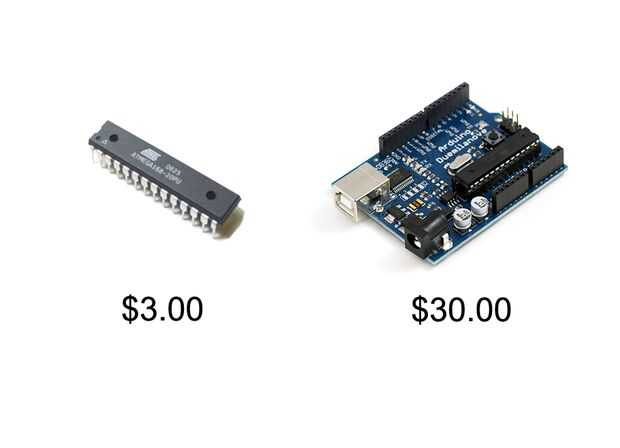 El ATMEGA168 chip, que hace todo lo que puede hacer el Arduino, cuesta alrededor de $3,00. (También puede utilizar el ATMEGA328 igualmente barato o ATMEGA328p--pero use un ATMEGA168p--los dioses Arduino no decidieron apoyar por alguna razón).