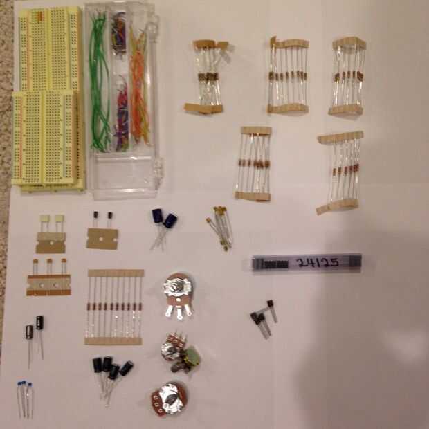 -algunas de las partes están marcados no utilizados en la imagen porque he comprado diferentes tipos de potenciómetros, diferentes valores de resistencias y muchos valores diferentes de condensadores.