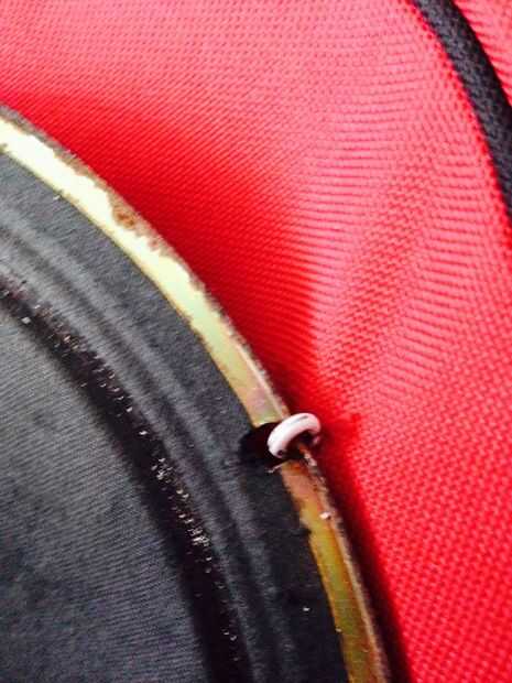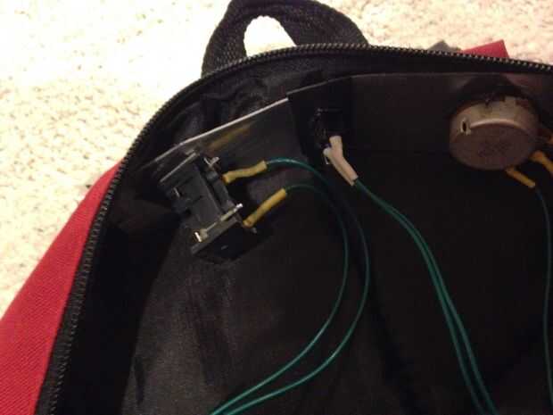Por último cortar un signo más en la parte frontal de la mochila, o cortar un agujero y su altavoz en él. Asegura mi altavoz en ritmo con el alambre poniendo el cable a través del altavoz de los agujeros de montaje y ajustándola a la mochila.