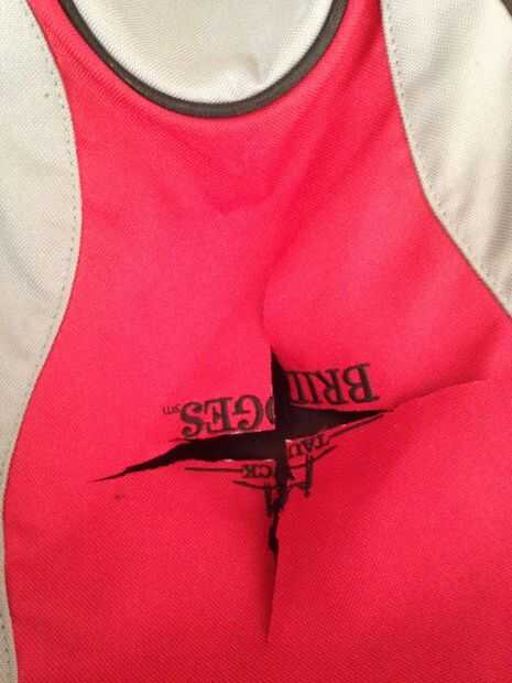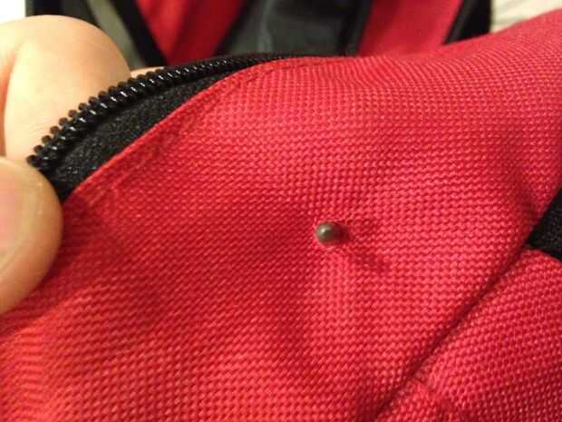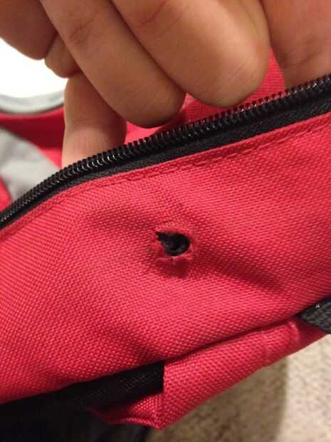 A continuación cortar los agujeros en la parte superior de la mochila (cerca de la manija) usaba un conjunto de golpes, pero tijeras funcionaría igual de bien.