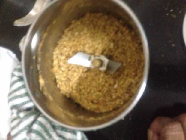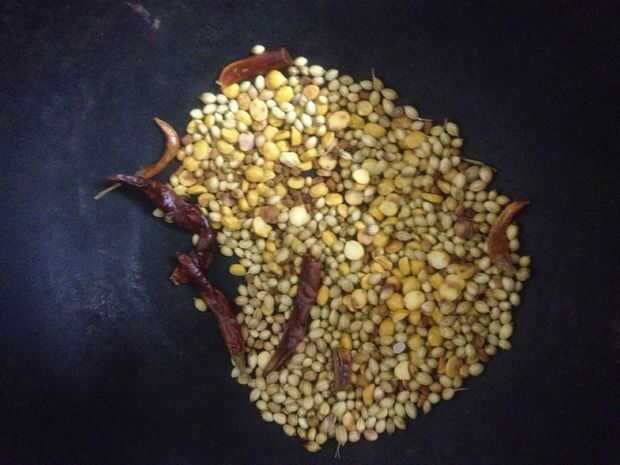 Secado de coco, semillas de alholva, chana dal, 4 chiles secos rojos, tabla cuchara tierra de semillas de cilantro en polvo después de asar todos excepto coco (llamado polvo de sambar)