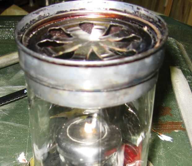 El primer problema radica en la creación de un lugar para la comida/bebida para sentarse mientras se calienta. Aunque en la foto vista desde arriba, parecería que sólo podía fijar un bote pequeño en la parrilla de la linterna, en la práctica, hacerlo sería causar el escape de dióxido de carbono de la lámpara se apague la llama de la lámpara. Perforación de agujeros en la parte superior de la linterna podría resolver este problema, pero entonces era parte del propósito de la parte superior de la linterna reducir el nivel de partículas en el escape para la versión de fuego verde de la lámpara (trióxido de diboro). Agujeros en la parte superior limitarían este aspecto de la eficacia de la parte superior.