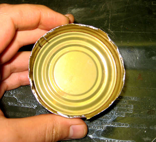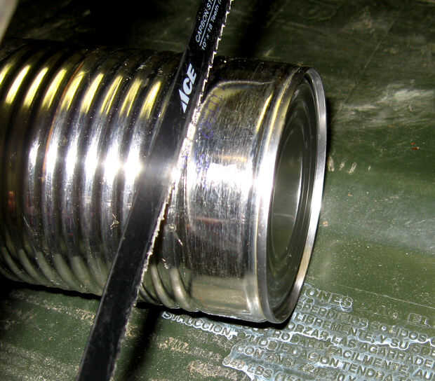 Ahora cortamos la base (extremo cerrado) de la can apagado del resto de la lata. He encontrado la forma más efectiva de hacer esto es utilizar una sierra para metales, pero no intentar directamente a través de la sierra. Montar la sierra en la ranura de la parte inferior de la sección acanalada y dibujar la sierra hacia usted de una vez. Luego, gire un poco la lata y repetir. Guardar el girar la lata, hacer un recorrido con la sierra hasta que empiece a usar a través del acero. Resistir la tentación de acabo de ver a través del recto hasta que hay pequeños agujeros desarrollando alrededor de la ranura que ha cortado. Cuando finalmente cortar a través, el puede simplemente debe desmoronarse. Otra ventaja de este enfoque es que el pequeño jags de acero que sobresalen después de que haya hecho el corte son finas como el papel y tienen menos posibilidades de corte. Nota que dije "menos probable" no "".