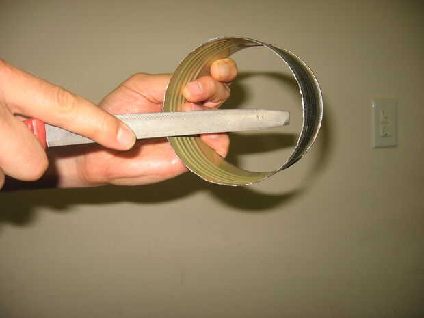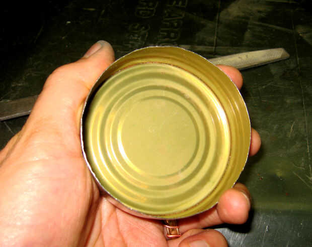 Limpiar el corte con una Lima (yo usé un archivo $1 que recibí de un depósito de ganga de Sears - nothin' lujo). Arrastre el archivo, suavemente, perpendicular al borde de la lata, sacar los jags poco metales que han metido doblados dentro de una posición vertical, luego archivarlos dibujando el archivo paralelo al lado de la lata. Esto irá una manera larga hacia limpieza-hasta el borde.