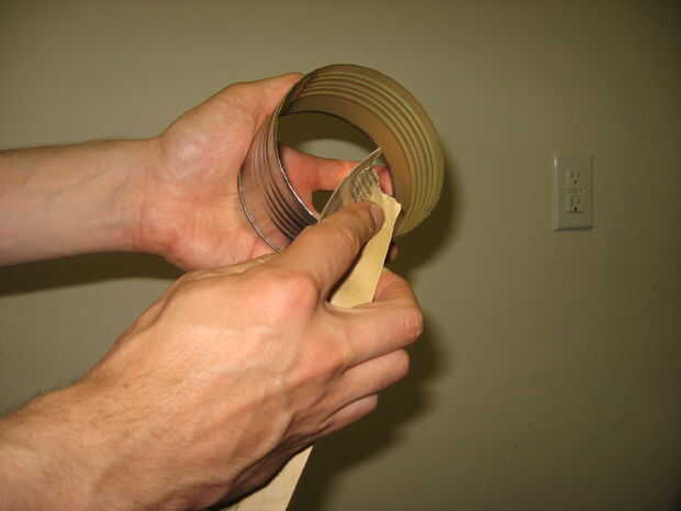 Vamos a hacer el vertido de la cacerola de la base de una lata grande (29 oz.). Uso alimentos Eden latas porque los revestimientos puede (a diferencia de la mayoría de las otras latas) no contienen BPA, un probable disruptor endocrino. Retire la etiqueta de la lata. El pegamento puede eliminarse con Goo-Gone (xileno) o fluido de encendedor (NAFTA). Un menos tóxico alternativa sería aceite vegetal, seguido de jabón. El aceite sirve como solvente no polar, y el jabón permite que el aceite se enjuagar con agua. La tiene más larga que los productos de petróleo mencionados, pero es mucho menos desagradable.