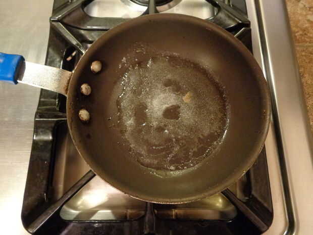 Sugiero freír el huevo más duro, porque al usar la prensa para dorar a la bruja, la yema de huevo puede salpicar sobre la prensa. Poner mantequilla en la sartén de tamaño mediana y freír hasta que la yema esté dura (esto es cómo cocinar un huevo duro).