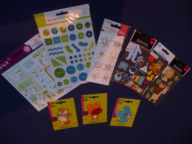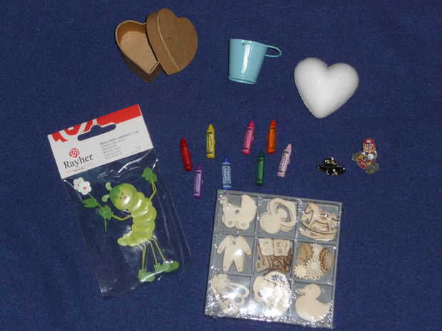 La principal técnica del scrapbooking consiste en la adición de objetos pequeños y pegatinas siempre en mantenimiento, por supuesto, con el tema y el código de colores de nuestra composición. Por lo que elegí, objetos tales como: un corazón de poliestireno que lápices decorados, pequeñas, de pines, una pequeña caja, algunos pequeños objetos de madera apropiado para el universo infantil. Por otra parte decido añadir pegatinas y las transferencias que hace referencia a la infancia (representando los chupetes de los niños, peluches, sonajeros), o a la persona a quien voy a ofrecerlo.
