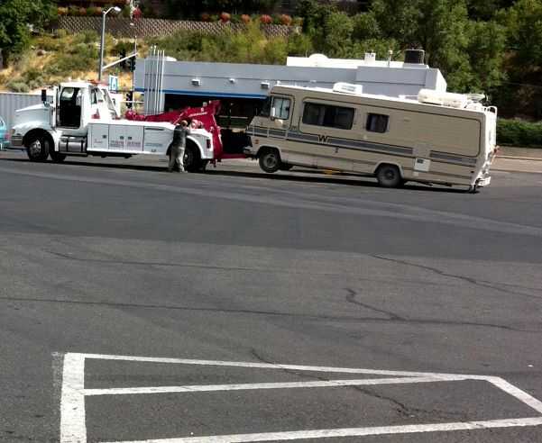 Ver una foto de una desgraciada RV remolcado a Reno desde lejos.