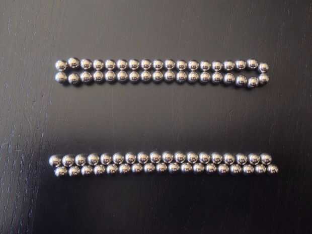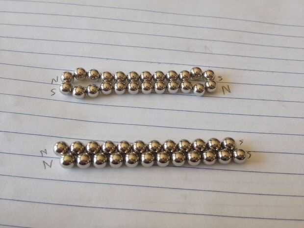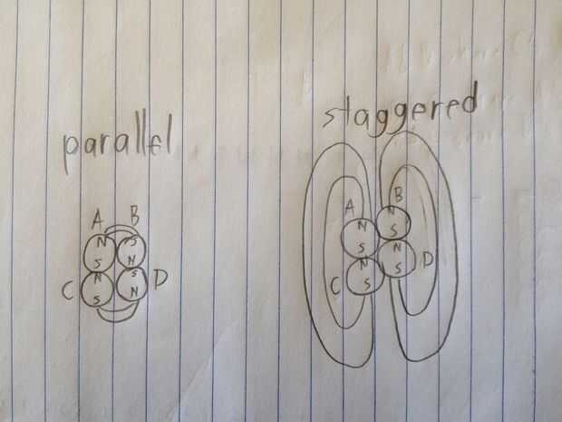 En el patrón escalonado, cada polo norte apunta en la misma dirección como cada otro polo norte. El campo para el patrón escalonado tiene que ir todo el camino desde S Polo N al polo S de C, dando por resultado un campo magnético más grande. La razón de que las líneas no vuelan aparte es que dos imanes al lado de uno a compartir un poste.