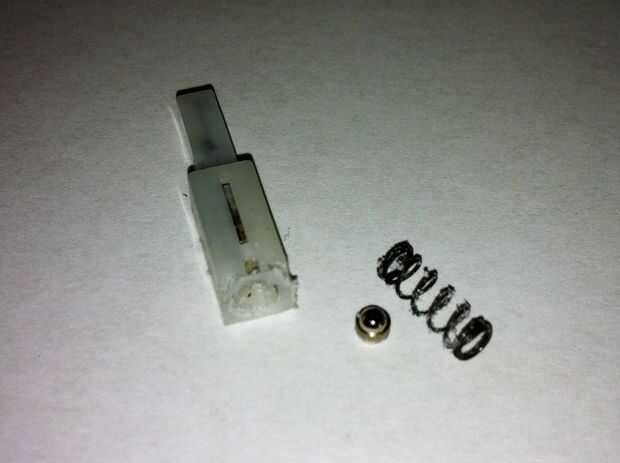 Punto en una dirección segura y haga clic y un casquillo del metal pequeño alojado en el canal central del encendedor deben salir. Escariar hacia fuera el extremo del canal hasta que el cautivo reset resorte dentro puede deslizar gratis.