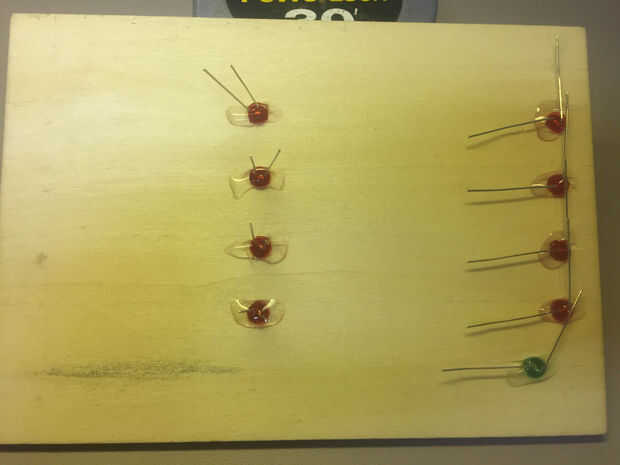 Inserte su LED y pegar hacia abajo. Alinean los cables del ánodo en el interior y el cátodo se conduce al exterior. Esto hizo fácil conectar todo junto. Antes de empezar todo cableado juntos, escribir sus opciones de pastel en la parte delantera de la placa de exhibición.