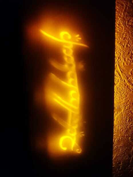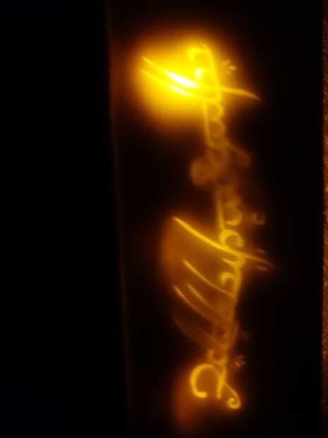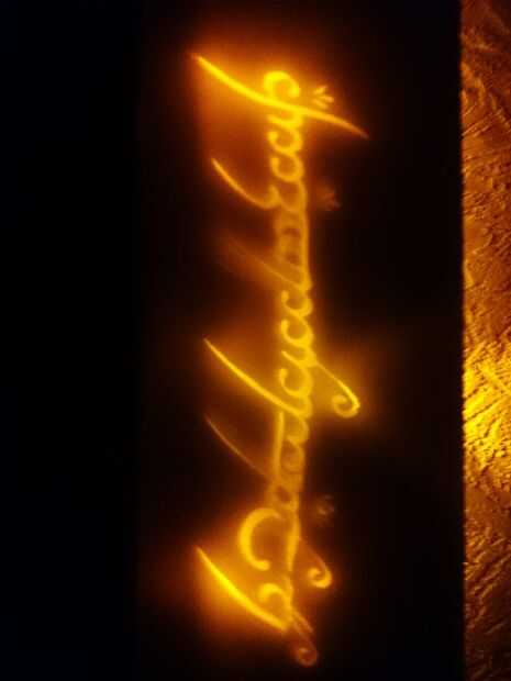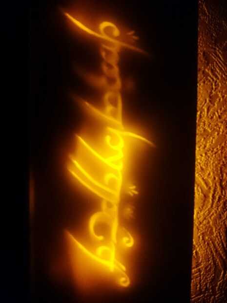 Colgar el póster en la pared, encienda todas las velas y poner cuidadosamente las velas detrás el, las velas brillará a través del plexiglás, película blanca sobre el plexiglás y los agujeros que cortamos el papel pero no a través del fondo de sí mismo creando el efecto de texto brillante!
