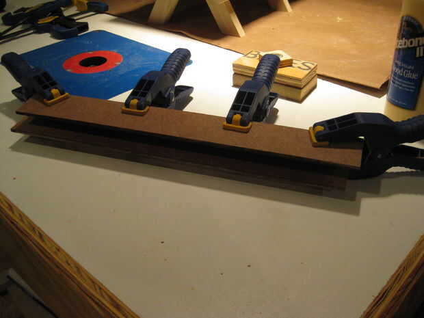 Pegue una tira de madera a cada lado de la madera contrachapada. Ser consciente de la orientación de la madera contrachapada. Queremos el veener suave hacia arriba de entre el sándwich de madera prensada. Usé pegamento, clavos y abrazaderas de resorte. También usé mi sierra de mesa para mantener todo al ras durante el montaje.