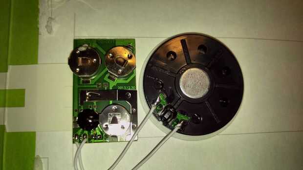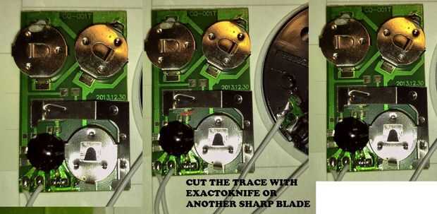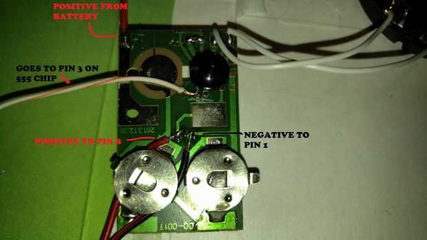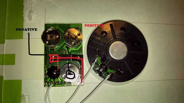 Ahora tenemos que encontrar lados positivos y negativos del circuito de la tarjeta. Primero quitaremos el plástico que activa el gatillo y luego dejamos que la música del final. La forma más fácil de encontrar lo que buscamos es el tomar un alambre y conectar los dos lados de un segundo, usted debe oír el altavoz empieza a reproducir la música cuando se toca el lado positivo y negativo para ese segundo. Prueba ahora estos dos puntos con un multímetro para encontrar cual es el lado positivo / negativo. Lo importante es encontrar los lados correctos y etiquetas positivas y negativas para más tarde. Ahora retire todas las pilas el circuito y reemplazar a los titulares en lugar y añadir nuestros cables positivos y negativos. Queremos poner el negativo en cualquier lugar tenemos un punto de soldadura buena. El lado positivo va a ser un poco más complicado. Queremos que use el interruptor de la tarjeta para activar nuestro nuevo batería. Así que tenemos que romper una conexión, siga el cableado positivo hasta encontrar una ubicación de fácil soldadura y una manera de cortar una conexión. En la mía encontró una almohadilla pequeña y podía fácilmente cortar el rastro de la placa de circuito, ten en cuenta que esto se activa nuestro circuito por lo que tiene que conectarse al blob negro grande de la tarjeta.