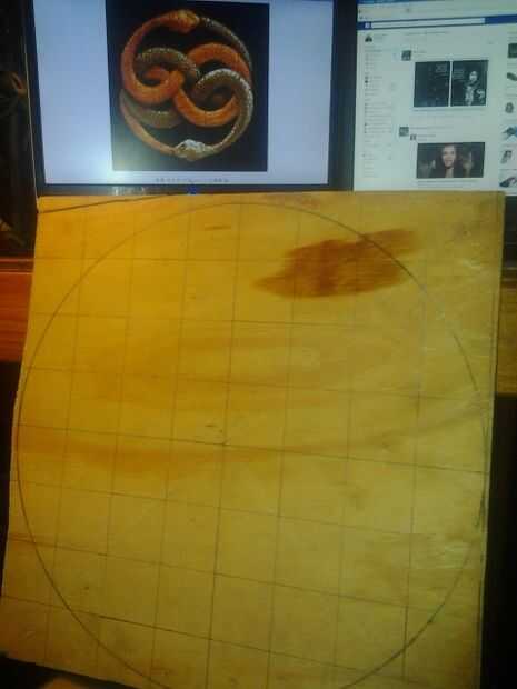 Ahora coloque la brújula en el punto central de la rejilla, extender hacia arriba hasta que quede a la misma distancia de la línea superior como la distancia entre la cabeza de serpientes y la línea superior de la red del. Imagen JPEG. Ahora con cuidado girar la brújula alrededor en un círculo un par de veces para marcar el círculo en la madera, si parece de borrar un poco justo el círculo entre las marcas de la rejilla y hacer otro ir en él!