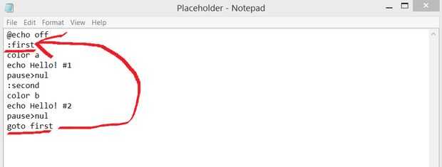 El comando "goto" pronunciado "Ir a" pueden ser mayúsculas o minúsculas. Se puede ir si desea. Esto se aplica a todos los comandos de archivo por lotes. Sin embargo, al escribir "help" en el símbolo del sistema muestra todos los comandos completo en mayúsculas. Personalmente puse todos los comandos y los marcadores de posición en minúsculas que se equivoca menos frecuentes. Altamente recomiendo a poner marcadores y comandos en minúsculas. Lo que hace es que va a la ": primer" marcador de posición.