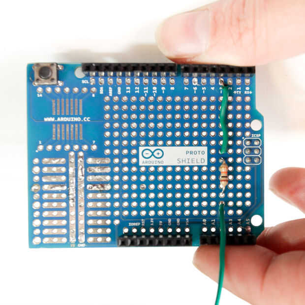 En el Protoboard, conecte un cable al pin digital 3 y soldar en su lugar, ejecutar un puente de alambre al centro del tablero que puede romper la línea con el mismo resistor del ohmio de 10 K de la protoboard.