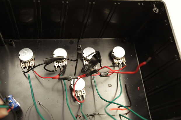 Los cables de señal de los potenciómetros del alambre a analógico 0-4, guardé las perillas de grano y la frecuencia en la primera fila de las perillas y los botones de sincronización por debajo de ellos.