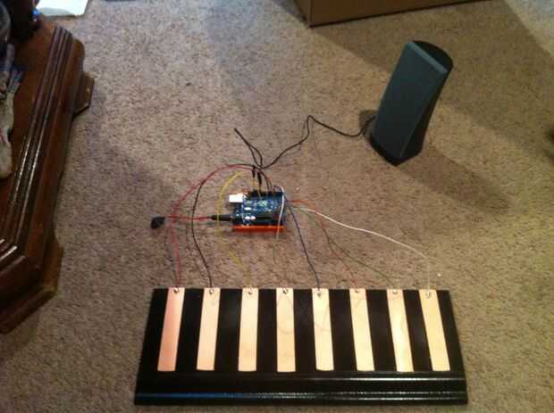 Inserte los cables principales y los cables del altavoz en el arduino. Ahora estás listo para probar tu creación. Conecte el cable de enchufe/9 voltios de barril a entrada de fuente de alimentación de arduino y conecte la batería de 9 voltios para el acoplamiento de la batería. Usted debe oír un sistema preprogramado de tonos musicales. Esperar unos 15-20 segundos para el dispositivo para calibrar a sí mismo. Trate de tocar todas las teclas. Cambiando de tema de debe jugar de cada clave. Si cada tecla juega, has creado el sintetizador. Los siguientes pasos implican la creación de la unidad de vivienda para contener el arduino y el altavoz. El punto de esto que no sólo sirven como una forma de sostener el resto de componentes, sino también para mantener la estética que mirar las teclas y el crear base.