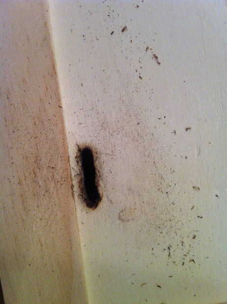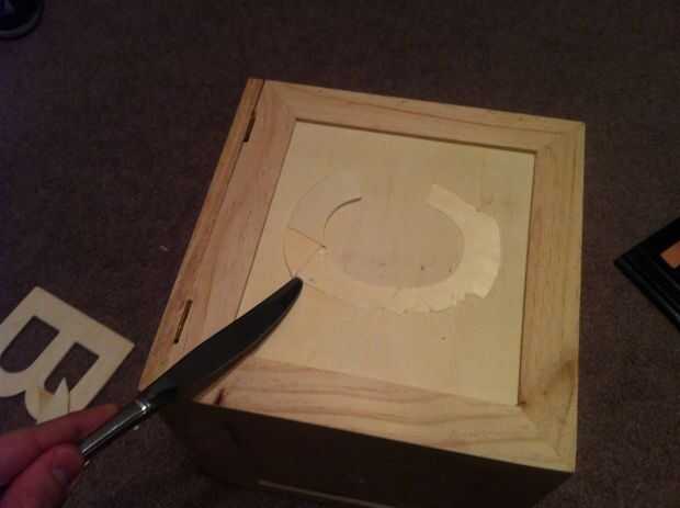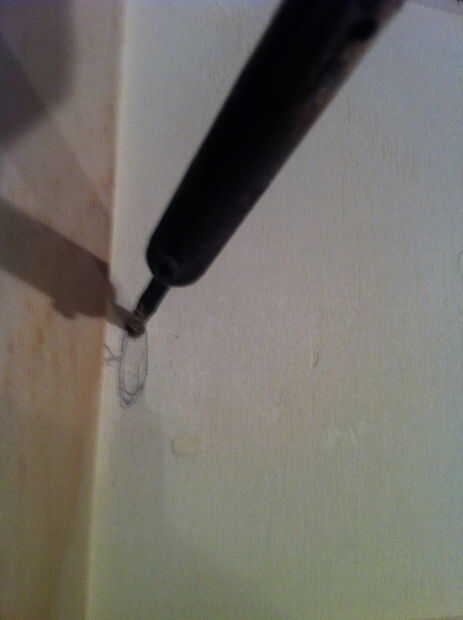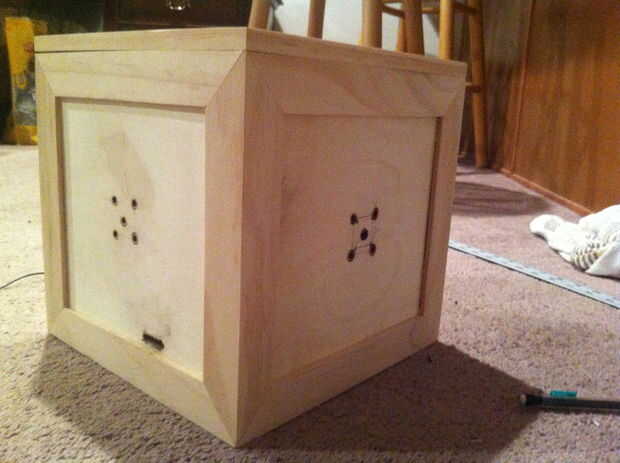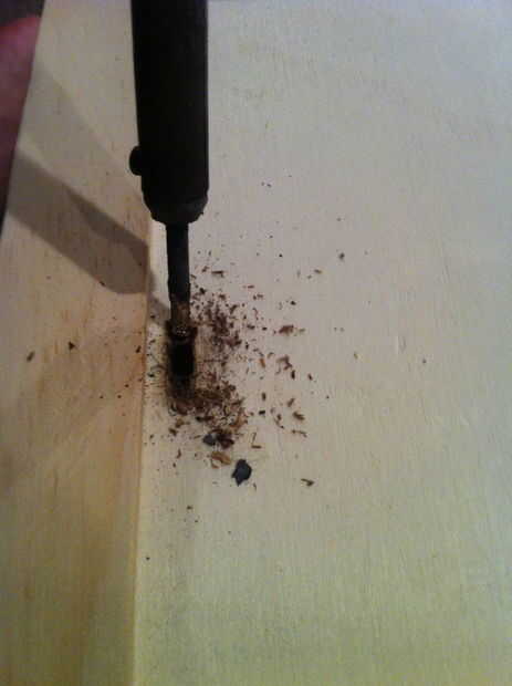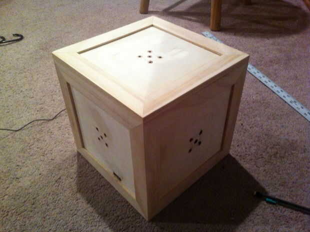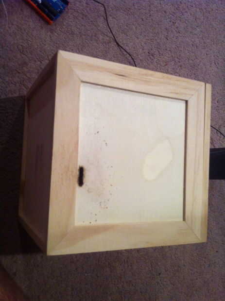 Para hacer el sonido de la bocina desde dentro de la caja más fácil oír, hice agujeros en cada lado de la caja. Averiguar dónde se siente que la ubicación óptima de los orificios debe ser colocando el arduino y el altavoz en la caja. Utilicé un patrón simple, 5 hoyos, pero no dude en utilizar su propio patrón. A continuación, crear un agujero lo suficientemente grande en la parte inferior de la parte delantera de la caja de los cables principales caber a través, por lo que puede ser fácilmente conectados a arduino. Una vez más, lije las superficies, dentro y fuera de la caja, donde fueron hechos los orificios, para hacer una superficie lisa y deshacerse de las restantes partículas madera colgante.