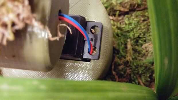 5. Coloque el cabezal de Torreta sobre plataforma extraíble de su servo y los cables que salen hacia la parte posterior a través de uno de los pequeños agujeros para tornillos de montaje de servo de la alimentación. Puede utilizar pegamento o pequeños tornillos para esto.
