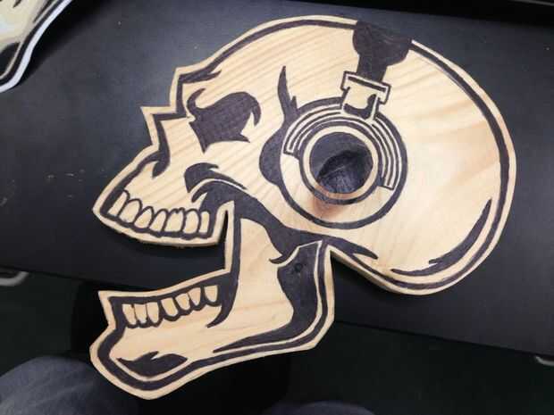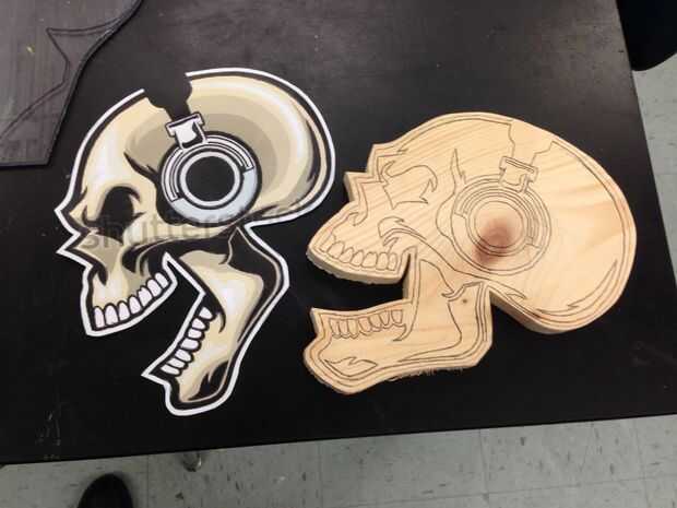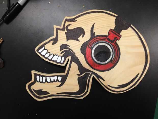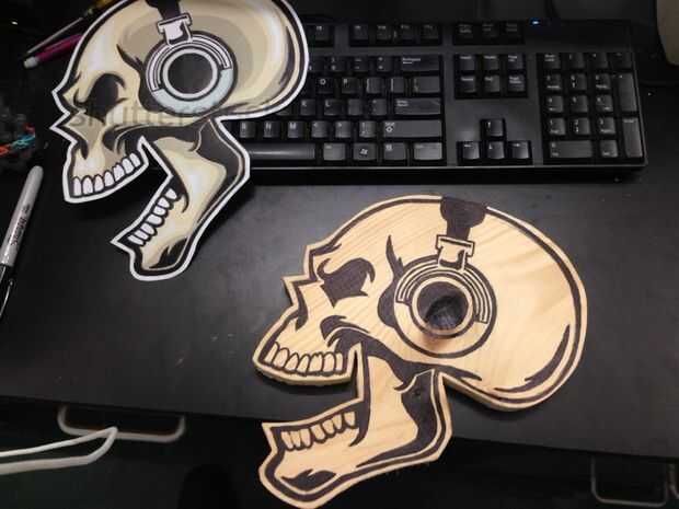 El primer paso es imprimir la imagen en el tamaño que desee su cráneo para ser. He incluido el archivo de imagen. Una vez que lo hace cortar el cráneo a lo largo del contorno de imágenes. Coloque el corte sobre la madera que va a utilizar y el rastro. He utilizado 3/4 pino porque eso es lo que tenemos una abundancia de la tienda, además de suave y fácil de arena y pintura. Luego recortar su contorno utilizando la Sierra de su opción, usé una sierra de banda. Arena que ha cortado y los bordes ligeramente con lija 220 o superior.