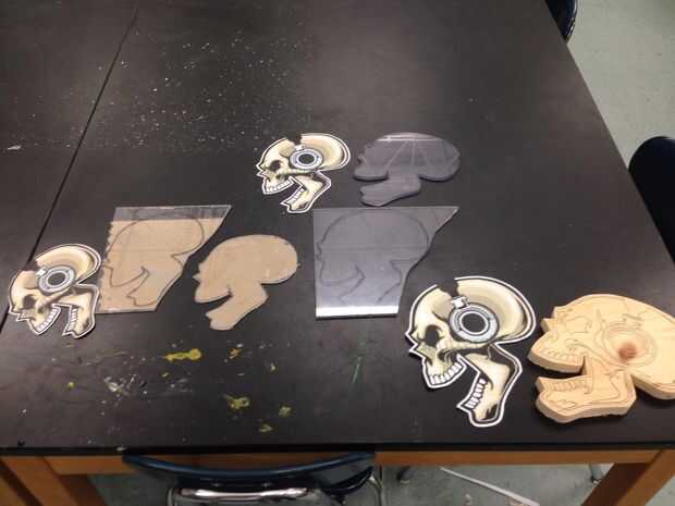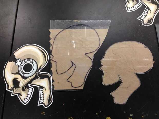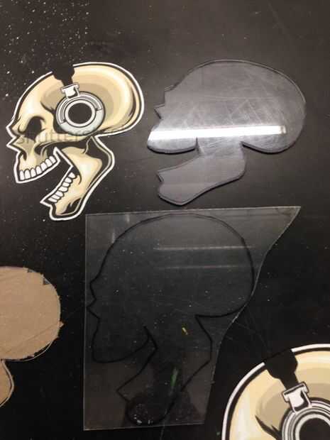 Usé 1/4" plexiglás para las piezas de mediados y 1/8" para las piezas exteriores. Para hacer estos imprimí dos más fotos de cráneo. Cada uno imprime un poco más pequeño que el otro. El 1/8" plexi conseguirá la imagen más pequeña. Cortar los contornos del cráneo para cada imagen.