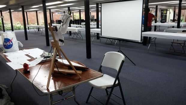 (la imagen de arriba muestra una pantalla de proyección detrás de donde se encuentra el cajón. Es sólo proporcionar un fondo para la foto inicial; no se utiliza por el sistema de dibujo. Aunque para el Maker Faire establecer una cámara de vídeo repuesta apuntando a lo que el usuario estaba llegando para que las multitudes que venían a ver pudieran ver sin aglomeración alrededor de la persona en la silla)
