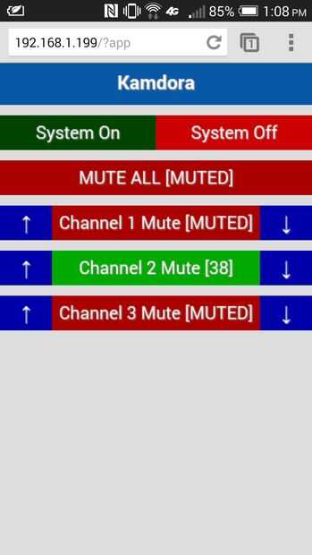 El sistema puede controlarse por todo lo que tiene un navegador web y está conectado a la red doméstica. Todo lo que tienes que hacer es tipo de la dirección IP de la arduino seguido de "/? app" (es decir, 192.168.1.199/?app) y llevarán a la aplicación de control para el sistema (se muestra en la imagen). Esto le permite cambiar el volumen de cada zona y encender un apagado del sistema.