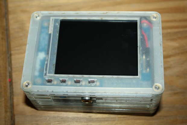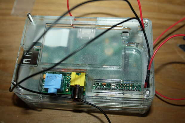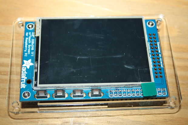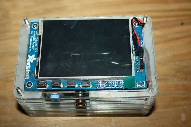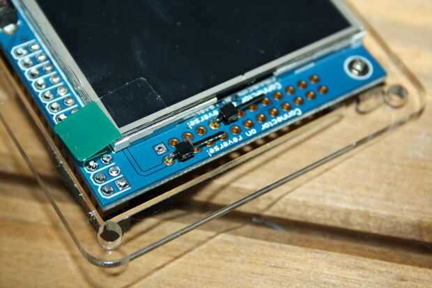 Dos pasadores de conectan a la PiTFT en el pin 2 (+ 5v) y pin 9 (GND). Antes de conectarlos a la comprobación de la potencia del volatages son correctas. Encontrarás el convertidor de DC DC necesita ajuste. Me puse a mina en 5.2v.