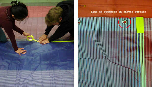 -Nota: Ducha cortinas vienen en un tamaño estándar de 70" cuadrados (dar o tomar una pulgada). Desea se superponen alrededor de 32 pulgadas en el centro, por lo que terminarás con alguna cortina de ducha adicional en el lado que se extiende más allá de la manta. Eso está bien; vamos a usar más tarde. También tendrás un forro polar extra en la parte superior; Usaremos esto demasiado.
