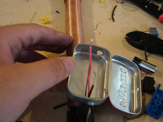 Pase los cables a través de uno de los agujeros que ha perforado. Ahora es el momento de cortar los cables a la medida, los conductores deben cortarse a un tamaño que debe caber dentro de la lata. Si no estás seguro sobre cuánto cable que necesario, recuerde que es mejor tener más cable que necesita, que menos.