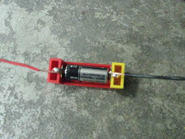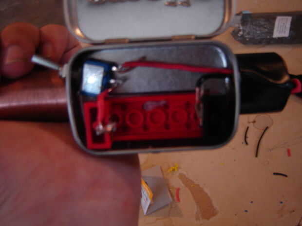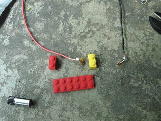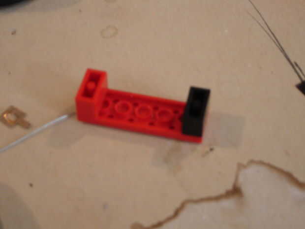 Para el contacto positivo, tomé un trozo de alambre y soldar al contacto. Siguiente, me hotglued el contacto en un ladrillo de Lego.