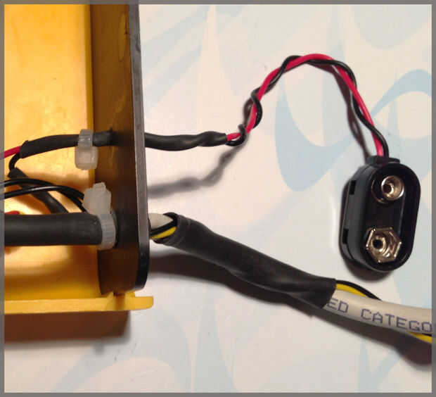 Al igual que lo que hicimos para el Cable de Control remoto en el paso 5, haga un orificio en el lado de la caja Universal plástico amarillo 135 x 95 x 45 mm (cerebro), lo suficientemente grande como para la batería cable conector Snap.