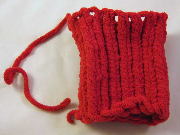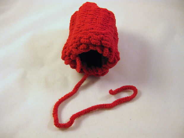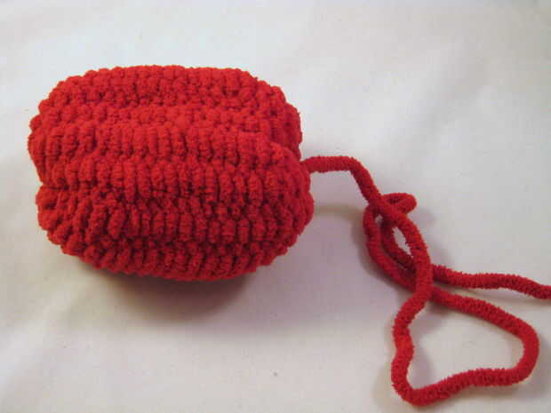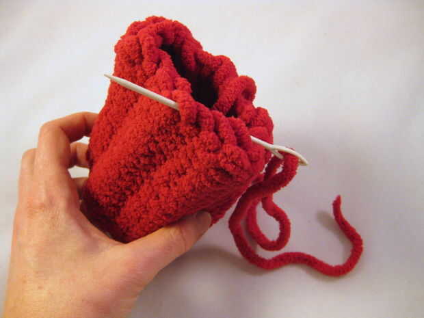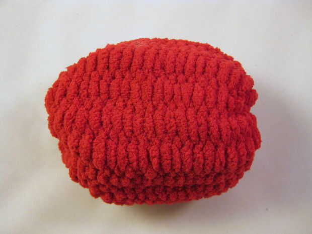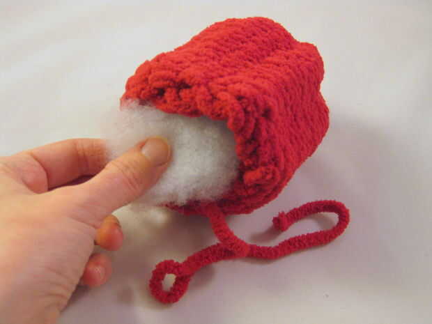 Hacerlo como lo hizo en el paso 2. Cuando usted corta de la bola de hilo, deje una cola de hilo que está sobre dos veces la longitud de la circunferencia del telar. Después de cerrar el "fin del trabajo" del sombrero, invierta el sombrero (de modo que las "crestas" son en el interior). Tomar la cola de hilos y coser en el contrario, extremo abierto. Que va a utilizar este hilo para cerrar este fin también, pero antes de cerrar, agregar algunos fiberfill del poliester. No cosas de la fibra – lo suficiente para darle alguna forma introduce. Entonces use el hilo para cerrar el extremo de la seta (atar el extremo del hilo y metiendo lejos en la seta).