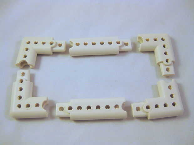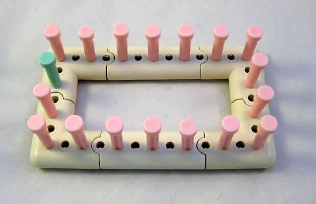 Conectar las piezas de telar para formar un pequeño rectángulo con dos piezas de 6 hoyos, rectos y cuatro 6 hoyos, pedazos de la esquina. Insertar una clavija verde en un agujero (marcando el inicio de la Ronda) y luego poner clavijas color rosa en todos los agujeros alrededor del telar. Ver las fotos para más detalles.