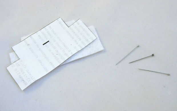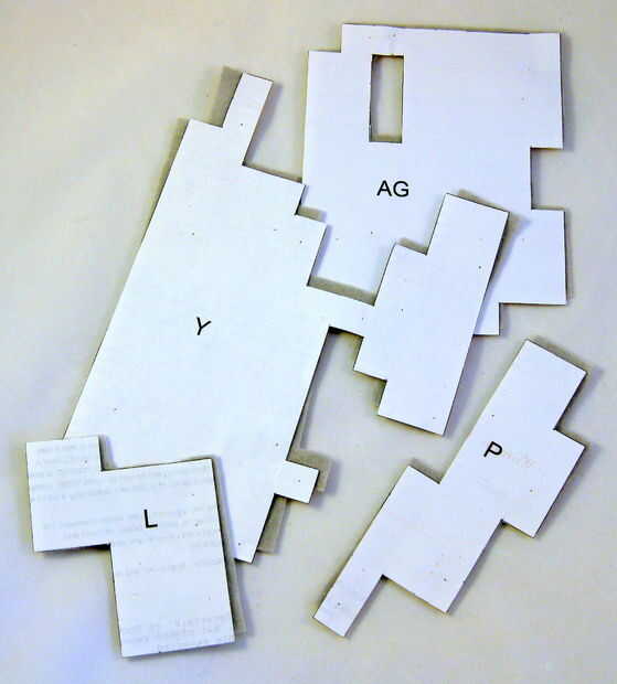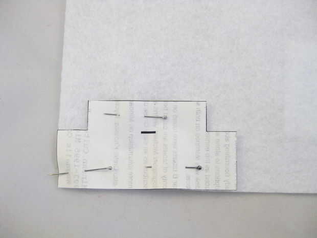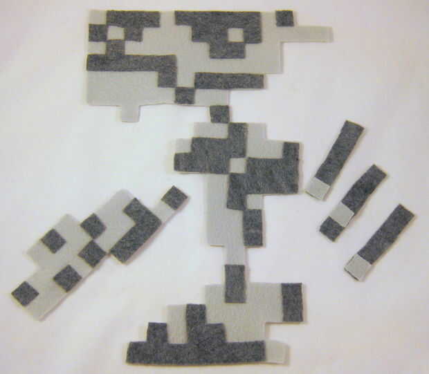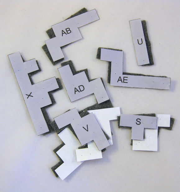 Corte con cuidado cada pieza marcada (por ejemplo, A, B, C...). Luego coloque temporalmente el papel del mismo color, fieltro con alfileres de costura o algo similar (véase los cuadros). (Los posibles colores son luz blanca, negro, gris, gris oscuro y rosa.) Con cuidado corte a la tela alrededor de los pedazos de papel. Usted necesitará cortar múltiples copias de algunas piezas. Habrá un número al lado de ellos, por ejemplo: (x15). Esto significaría que usted tendría que cortar 15 ejemplares de esta pieza de fieltro. Después de cortar cada pieza de fieltro, recomiendo dejar la plantilla de papel apiladas encima de ella para que usted pueda recordar fácilmente qué pieza con letras es posterior.
