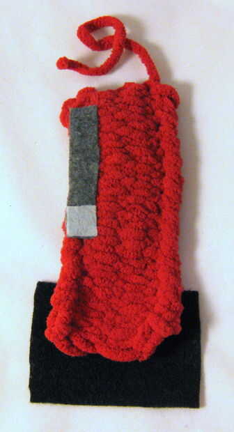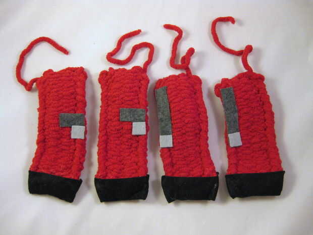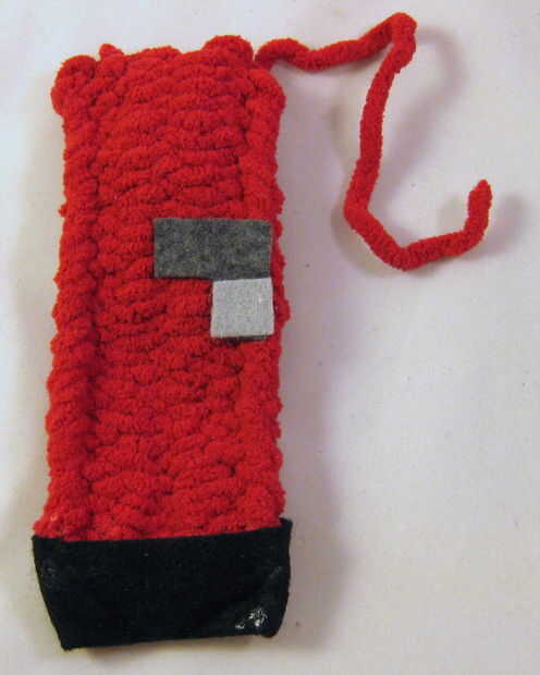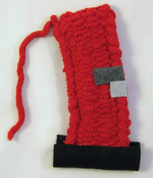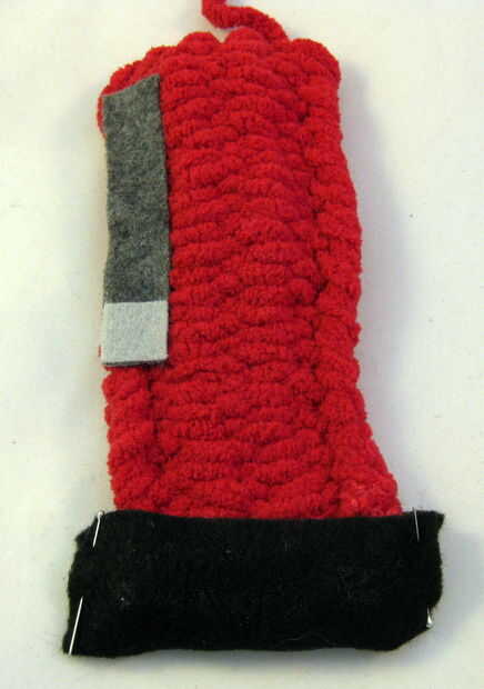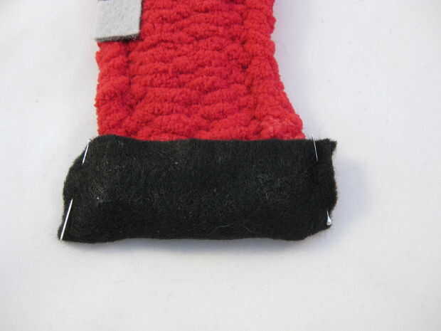 Las piezas AJ (rectángulos grandes, negros) son los enganches. Doblar los enganches en la parte inferior de cada pata, como se muestra en las fotos aquí. Debe haber un pequeño extra en los lados izquierdo y derecho de cada pezuña. El pegamento de las pezuñas en este. Una vez hayan secado, tome los bordes extra fieltro, los pines juntos (si es necesario) y doblarlas hacia atrás. Pegamento al revés como este (por lo que el extra fieltro está en los lados traseros de las piernas), mediante un clip binder para sostenerlas mientras que pegamento funciona muy bien.