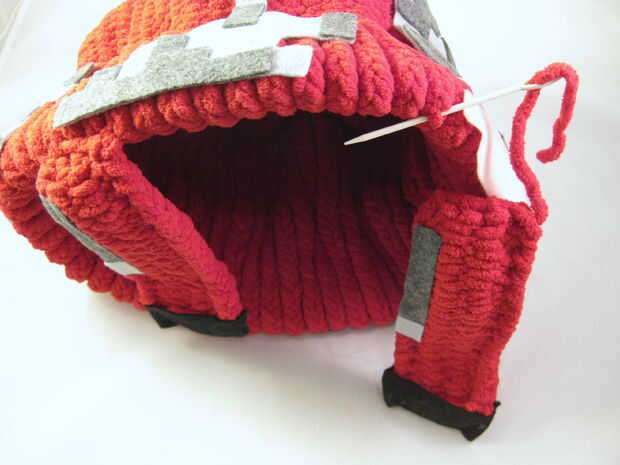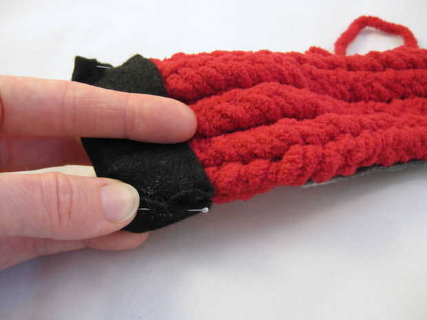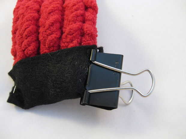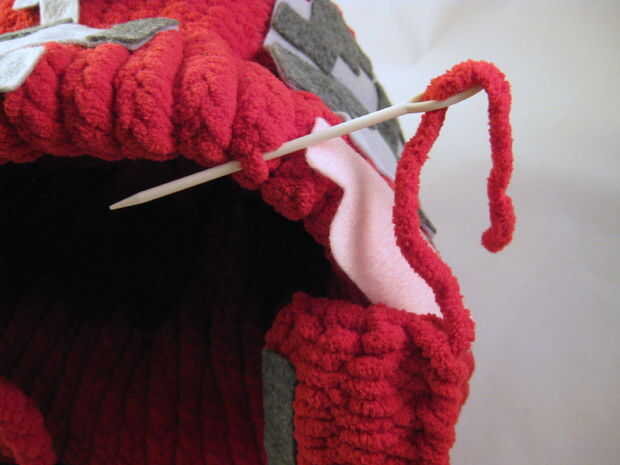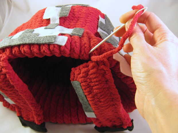 Utilizan la cola de hilo de las piernas (si está disponible) para coser en el borde del sombrero. (Si hay no una cola disponible, use un nuevo pedazo de hilo.)