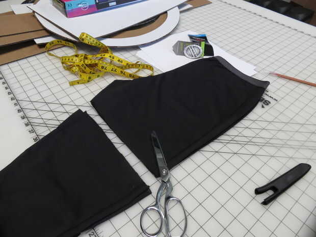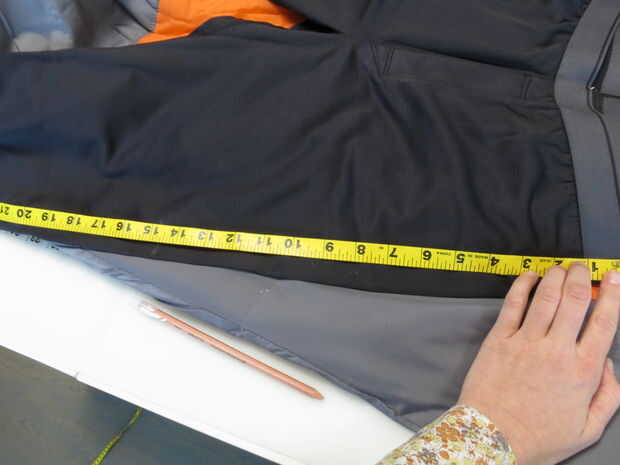Con los pantalones hasta mi cuerpo les marqué los pantalones sería lo suficientemente largos para cubrir justo por encima de la rodilla hasta el tobillo. Doblar los pantalones por la mitad, teniendo cuidado de que ellos se alinean perfectamente. Luego, corte los pantalones a la longitud deseada.