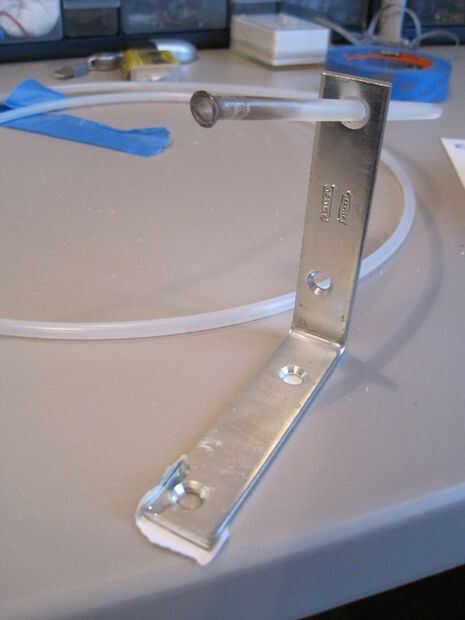 Arriba os muestro la 4" L-soporte que recibí de Lowe, así como la 3' longitud de tubería polivinilo de 1/4 OD ya acoplada. Lo siento no tomar cualquiera antes de fotos!
