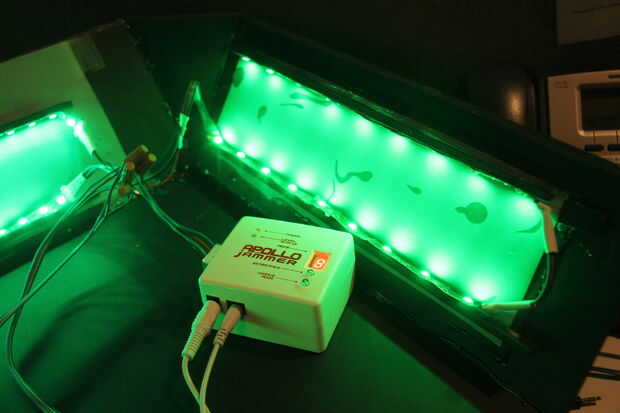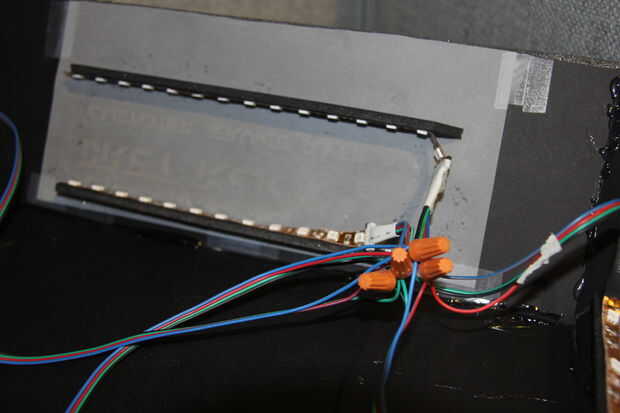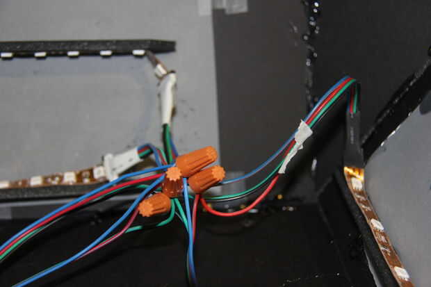 A continuación puede adjuntar un conector RGB EZ al final de uno o ambos de las tiras RGB y funcionar detrás a la Jammer de Apolo. La forma más fácil de conseguir que todos para conectar es a tuerca del alambre todos los cables de colores como (azul a azul a azul por ejemplo) a otro alambre correr detrás a la Jammer de Apolo. Repita esto con cada color de cable.